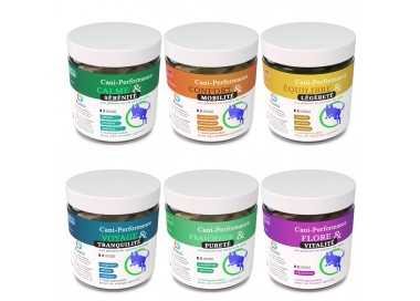 Le Pack Compléments Alimentaires réunit l’ensemble de la gamme Bien-être Caniperformance en format 2 pots de 100g par référence, permettant aux professionnels de proposer une sélection cohérente et accessible autour du bien-être quotidien du chien. Il comprend Flore & Vitalité, pour accompagner l’équilibre digestif, Équilibre & Légèreté, pour soutenir le confort alimentaire, Confort & Mobilité, pour favoriser l’aisance de mouvement, ainsi que Fraîcheur & Pureté, destiné à maintenir une haleine fraîche. Le pack inclut également Calme & Sérénité, pour une approche apaisante naturelle, et Voyage & Tranquillité, idéal lors de déplacements ou situations nouvelles.